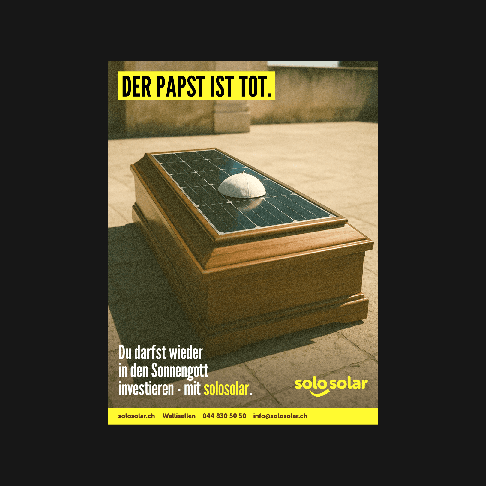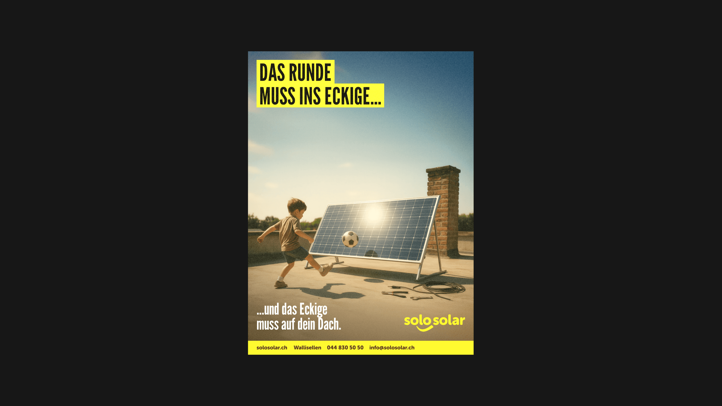 Für die SoloSolar GmbH, ein Unternehmen, das auf Solaranlagen spezialisiert ist, haben wir eine aufmerksamkeitsstarke Kampagne entwickelt. Mit aktuellen Themen, pointierten Sprüchen und einem Augenzwinkern bringen die Inserate, Onlinebanner und das Werbevideo nachhaltige Energie in die Köpfe der Zielgruppe – und auf ihre Dächer.